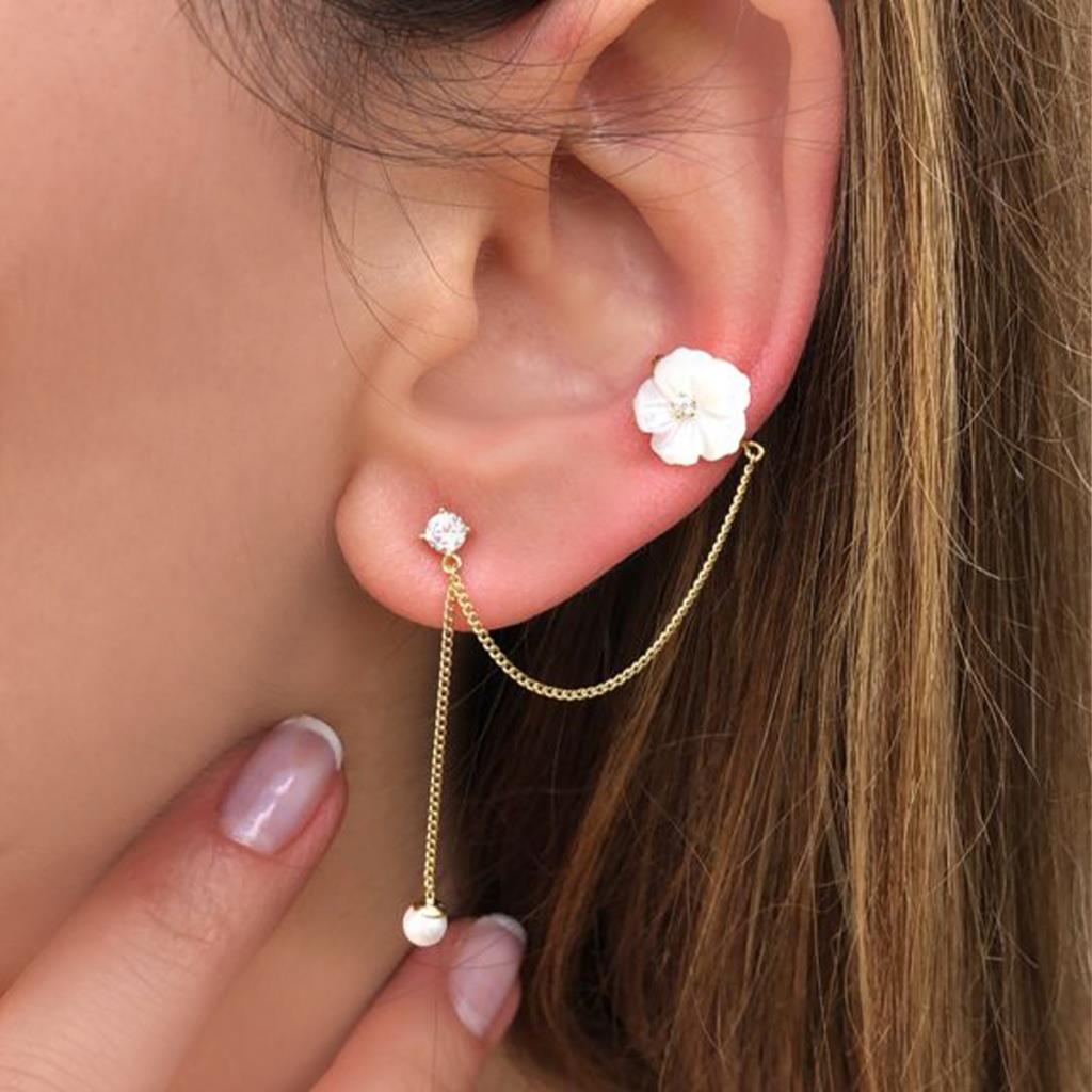 Çiçek Model Zirkon Taşlı Gold Kaplama Kombin Zincir Gümüş Küpe (kpzrk041453)