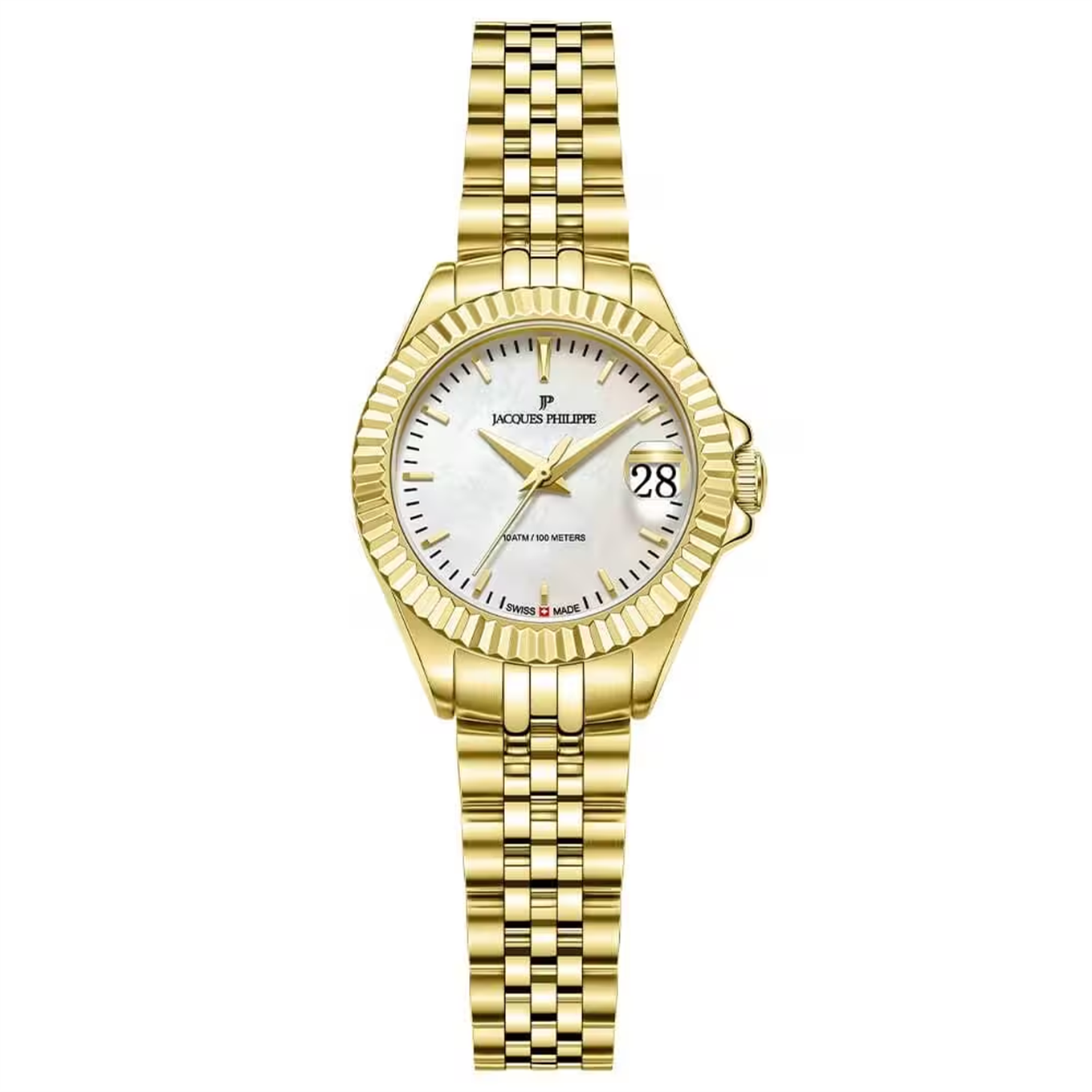 Jacques Philippe'nin seçkin koleksiyonundan bu özel saat modeli, modern ve etkileyici görünümü ile öne çıkıyor. Yuvarlak kasa yapısı ve Çelik kordon özelliği ile kadınlar için ideal bir seçim. 10 ATM ile günlük kullanıma uygun olan bu şık saat, 26 mm kasa çapı ile mükemmel bir kullanım deneyimi sunuyor. Sedef kadranı ve Safir camı ile uzun ömürlü kullanım için tasarlandı.