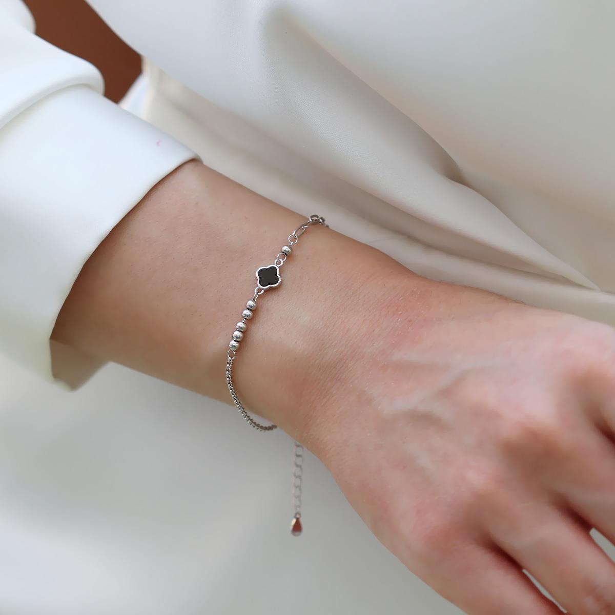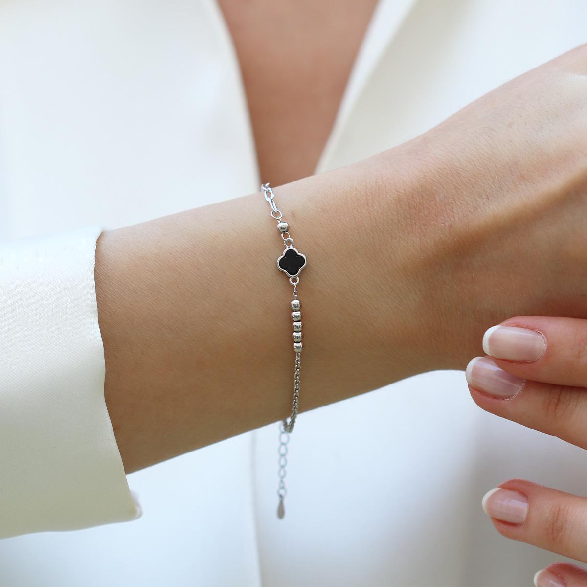 Yonca Siyah Mineli Trend Gümüş Bileklik